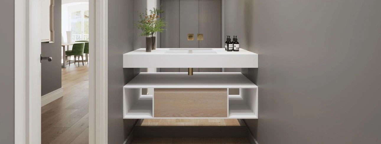 Yes, all our furniture is designed with the demands of the bathroom in mind. Corian® is non-porous, highly resistant to moisture and built to withstand everyday wear. Darker colours may show watermarks or scratches more easily and require extra care. Solid oak is treated with a premium wood protector to further enhance its natural resilience to moisture. Lacquered wood provides excellent humidity resistance and scratch protection when properly maintained.