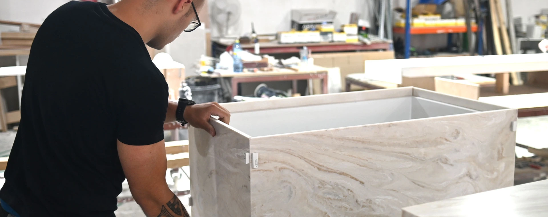 • Corian®: Wipe with a damp cloth and mild cleaner for effortless maintenance. Its non-porous surface resists stains and is easy to keep pristine.